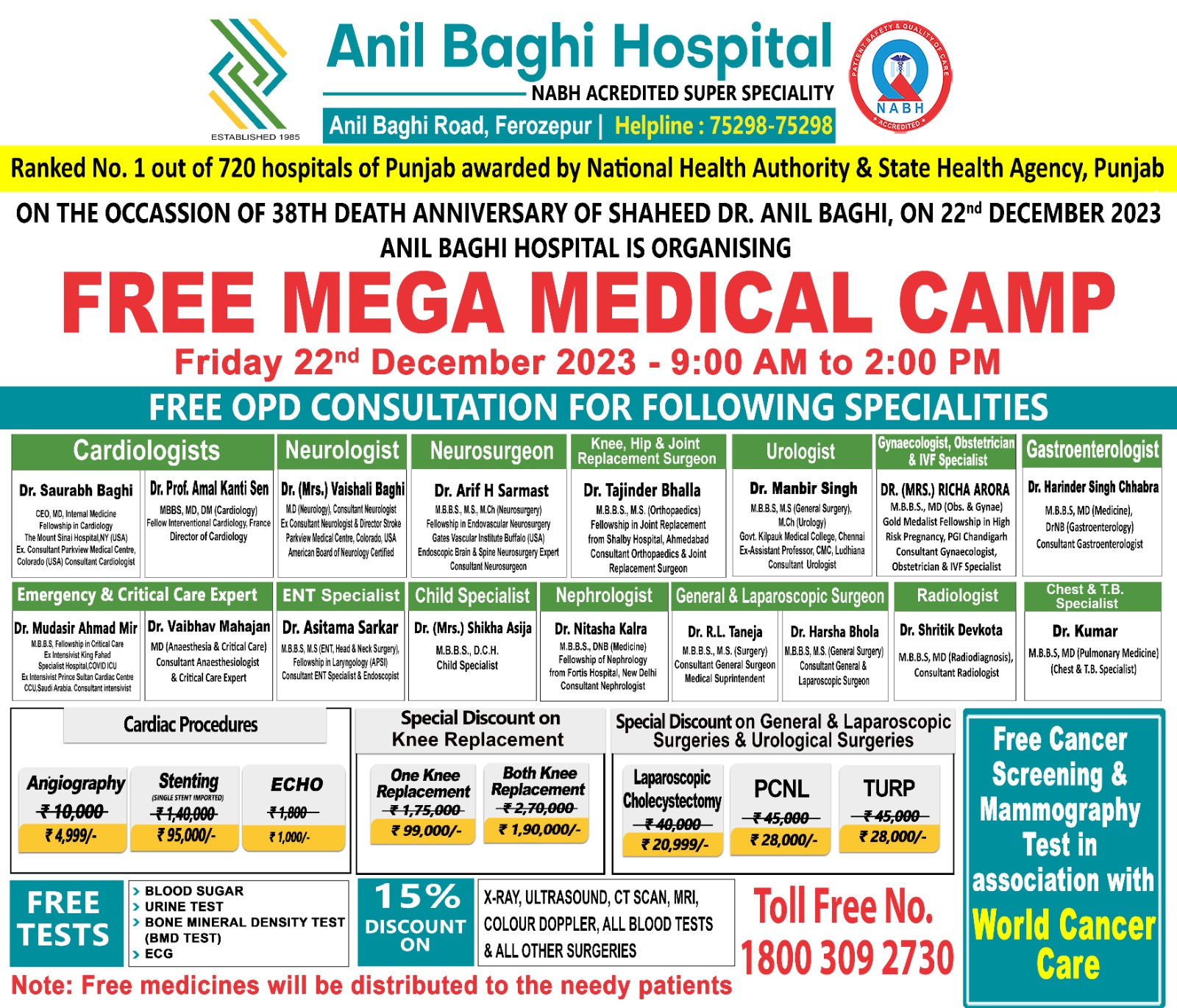 To mark the 38th death anniversary of Dr. Anil Baghi, Anil Baghi Hospital is organizing a free mega medical camp on Friday, December 22nd, 2023, from 9:00 AM to 2:00 PM. This comprehensive camp, open to all, offers consultations with leading specialists across 15 key medical disciplines, making it a valuable opportunity for comprehensive healthcare access in Ferozepur.